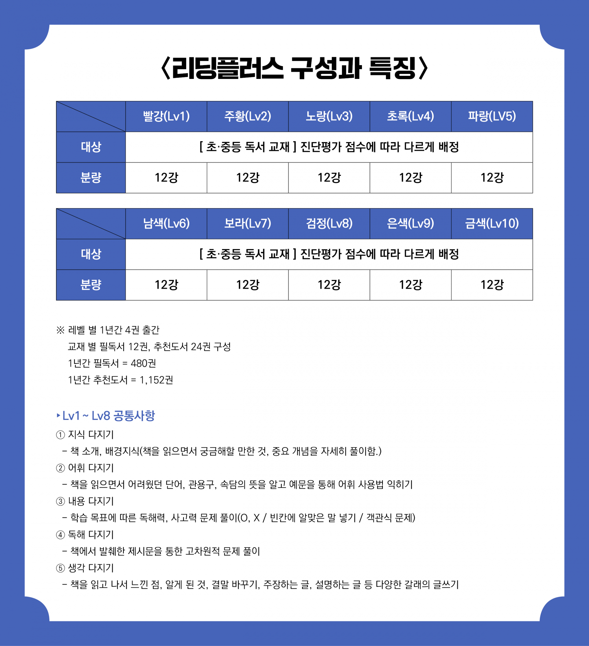 다양한 독서의 방법을 체계적으로 키워 주는 책입니다. 설명문, 논설문과 같은 글을 읽을 때와 동화나 소설을 읽을 때는 글의 내용을 이해하는 방법이 조금씩 다릅니다. 비문학적인 글을 읽을 때에는 글에 나타난 정보나 사실을 이해하여 주제나 중심 생각을 파악하는 것이 중요합니다. 그리고 문학적인 글을 읽을 때에는 주제뿐만 아니라 글 속의 숨은 의미와 분위기를 통해 글쓴이의 의도를 짐작하고 그에 대한 나의 생각이나 느낌도 표현할 수 있어야 합니다. ‘리딩플러스’는 독서 습관을 들이는 것부터 시작해 여러 유형의 문제를 풀어 보고 더 나아가 다양한 종류의 독후활동지를 작성해 봄으로써 글쓰기의 능력까지 향상할 수 있는 독서 논술 교재입니다.